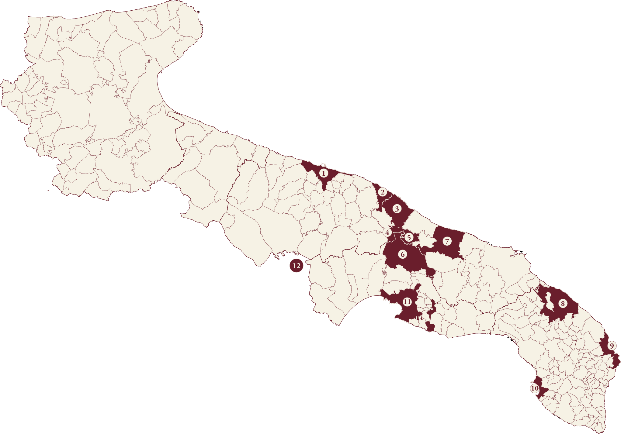 (1) Bari (2) Polignano a Mare (3) Monopoli (4) Alberobello (5) Locorotondo (6) Martina Franca (7) Ostuni (8) Lecce (9) Otranto (10) Gallipoli (11) Taranto (12) Matera